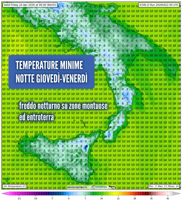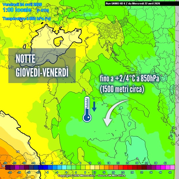 Come detto, il passaggio fresco e instabile sarà breve, permettendo nel weekend una rapida espansione dell’anticiclone da ovest che riporterà stabilità e un aumento delle temperature. Il rialzo sarà comunque contenuto rispetto ai giorni scorsi, con valori miti di giorno ma in linea col periodo. Le nottate successive saranno più fredde, specie tra venerdì e sabato quando le temperature notturne scenderanno in modo deciso specialmente sulle zone collinari e montuose.