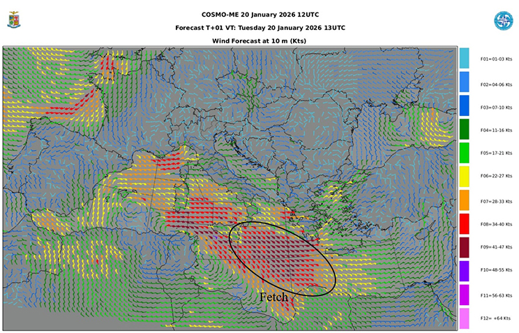Fig. 1 – Simulazione dell’intensità dei venti a 10 m nel pomeriggio del 20 gennaio. Fonte Aeronautica Militare.