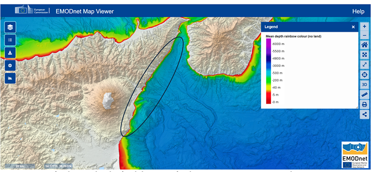 Fig. 3 – Profondità media dei fondali. Le profondità maggiori sotto costa si hanno tra Catania e Messina. Fonte: https://emodnet.ec.europa.eu/geoviewer/
