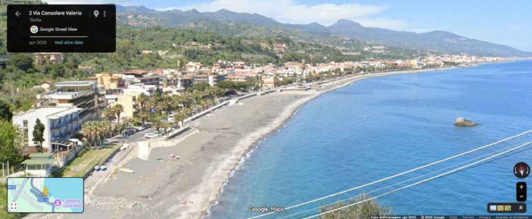 Fig. 6 – Litorale di Sant’Alessio Siculo nel 2025. Si nota l’arretramento della linea di riva rispetto allo scoglio di riferimento e la presenza di urbanizzazioni realizzate sull’originaria fascia dunale. Fonte Google Maps.