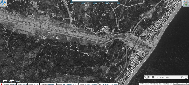 Fig. 9 – Foto aerea del 1988 in cui si osserva la regimentazione idraulica della Fiumara d’Agrò, principale alimentatore sedimentario delle spiagge di Sant’Alessio Siculo e Santa Teresa di Riva. Fonte Geoportale Nazionale.