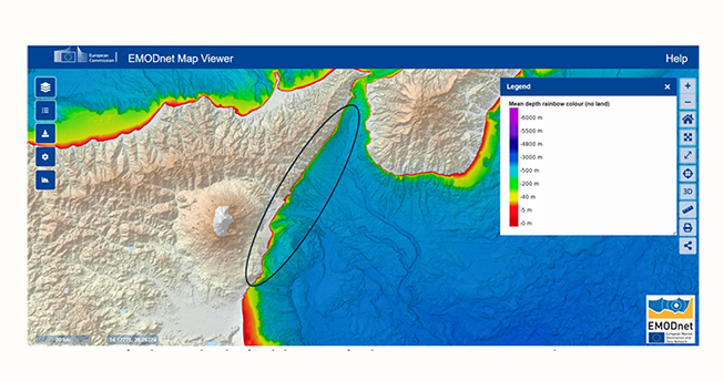 Fig. 3 – Profondità media dei fondali. Le profondità maggiori sotto costa si hanno tra Catania e Messina. Fonte: https://emodnet.ec.europa.eu/geoviewer/