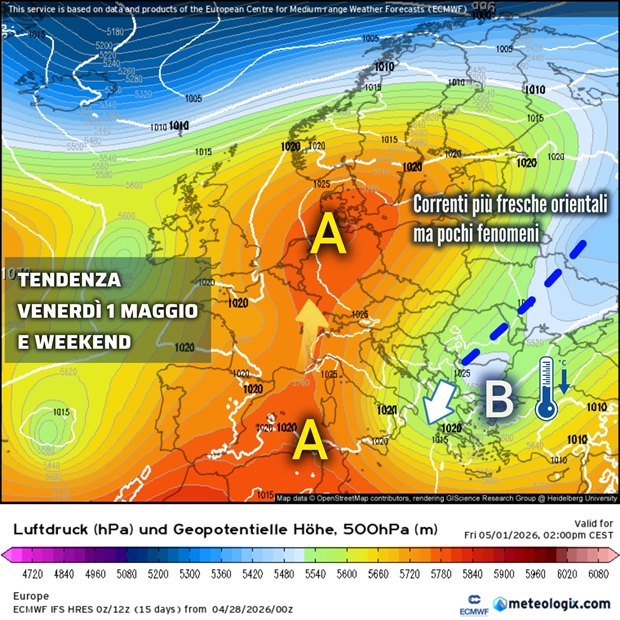 Le tendenze modellistiche per il weekend del 1° maggio mostrano invece un parziale cambiamento delle condizioni atmosferiche. Nei prossimi giorni infatti l’anticiclone si disporrà con un promontorio esteso fino alla Germania, tra Regno Unito e Scandinavia. Ciò favorirà lo scorrimento di una massa d’aria fredda dalla Russia sul bordo orientale, che punterà la Grecia e i Balcani.