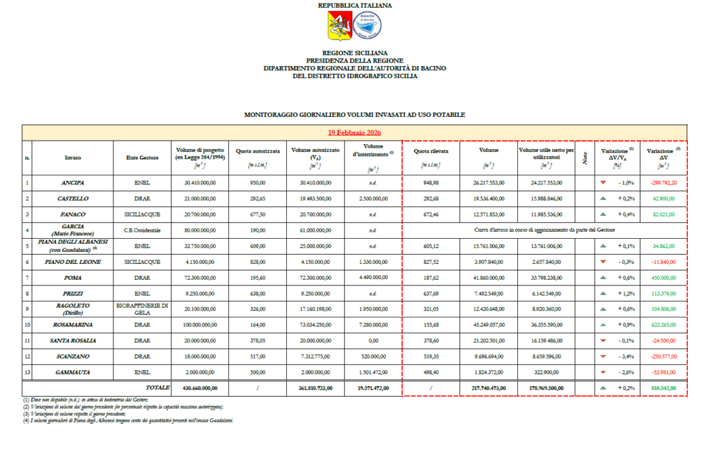 L’ultimo bollettino mensile regionale (a cura dell’Autorità di Bacino) risale al 1 febbraio e mostra già notevoli miglioramenti, ma il monitoraggio giornaliero dei soli invasi ad uso potabile aggiornato al 19 febbraio evidenzia ancor di più l’ulteriore riempimento avvenuto da inizio febbraio: