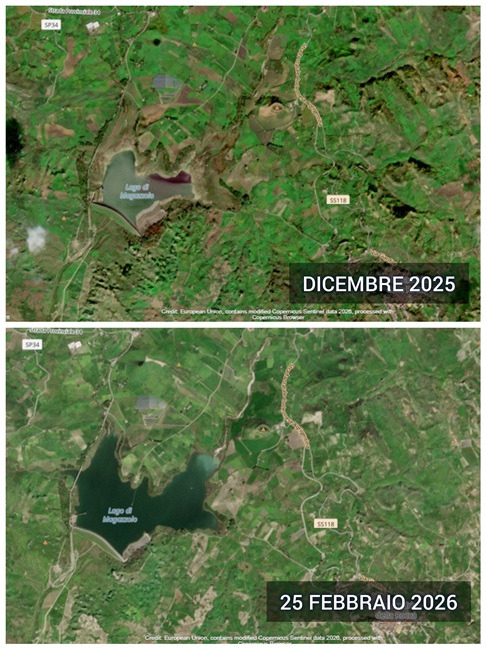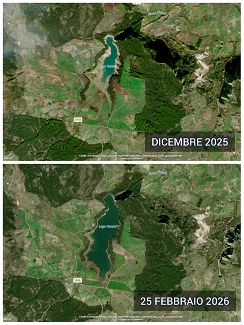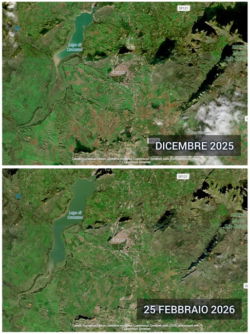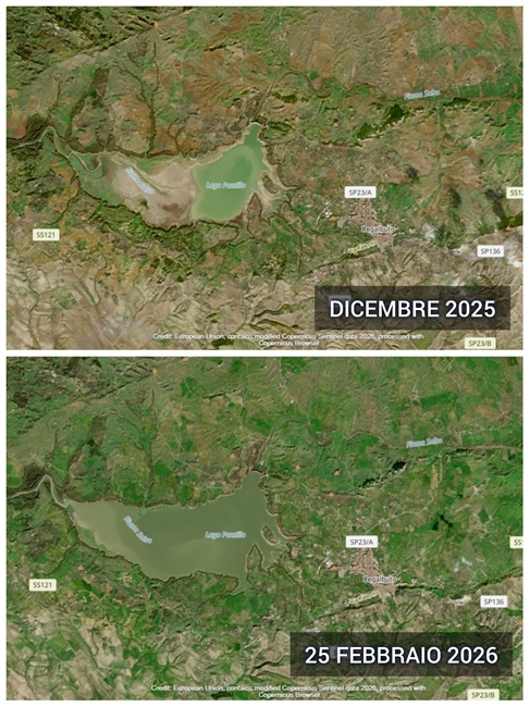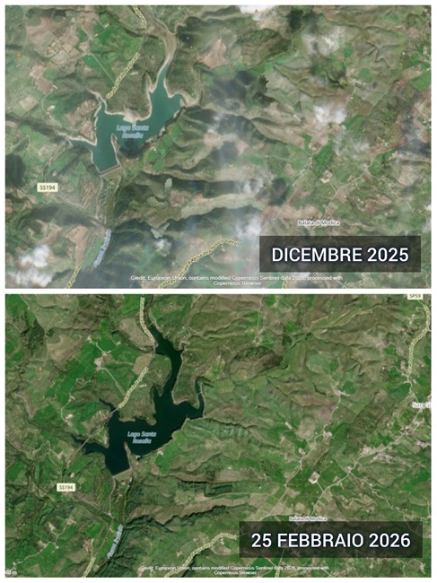 Vi mostriamo un’eccezionale confronto satellitare che evidenzia il drastico cambiamento avvenuto da dicembre 2025 in relazione al riempimento degli invasi siciliani provenienti da un lungo periodo di forte deficit, grazie al notevole periodo perturbato di inizio anno che ha chiuso temporaneamente uno stato duraturo di siccità. Le immagini satellitari aggiornate sono relative a mercoledì 25 febbraio 2026.