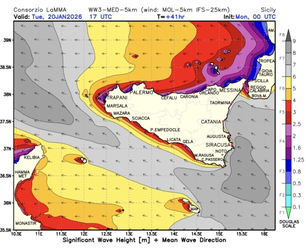 La situazione tenderà a migliorare, in riferimento all’intensità delle varie fenomenologie, nel corso di mercoledì mattino, tuttavia anche durante quest’ultima giornata saranno possibili precipitazioni sparse un po’ ovunque, con generale moderata attenuazione sia dello scirocco che del moto ondoso ionico.