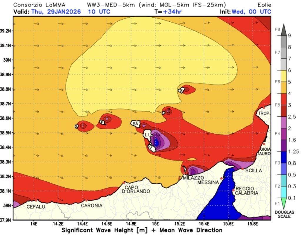 Il moto ondoso del Tirreno subirà dunque un rapido incremento: si prevedono condizioni di mare agitato tra il mattino e il pomeriggio sul settore tirrenico insulare (onde fino a 3-4 metri), perfino molto agitato nei pressi delle Eolie (onde fino 5-6metri) con mareggiate sui settori costieri esposti.