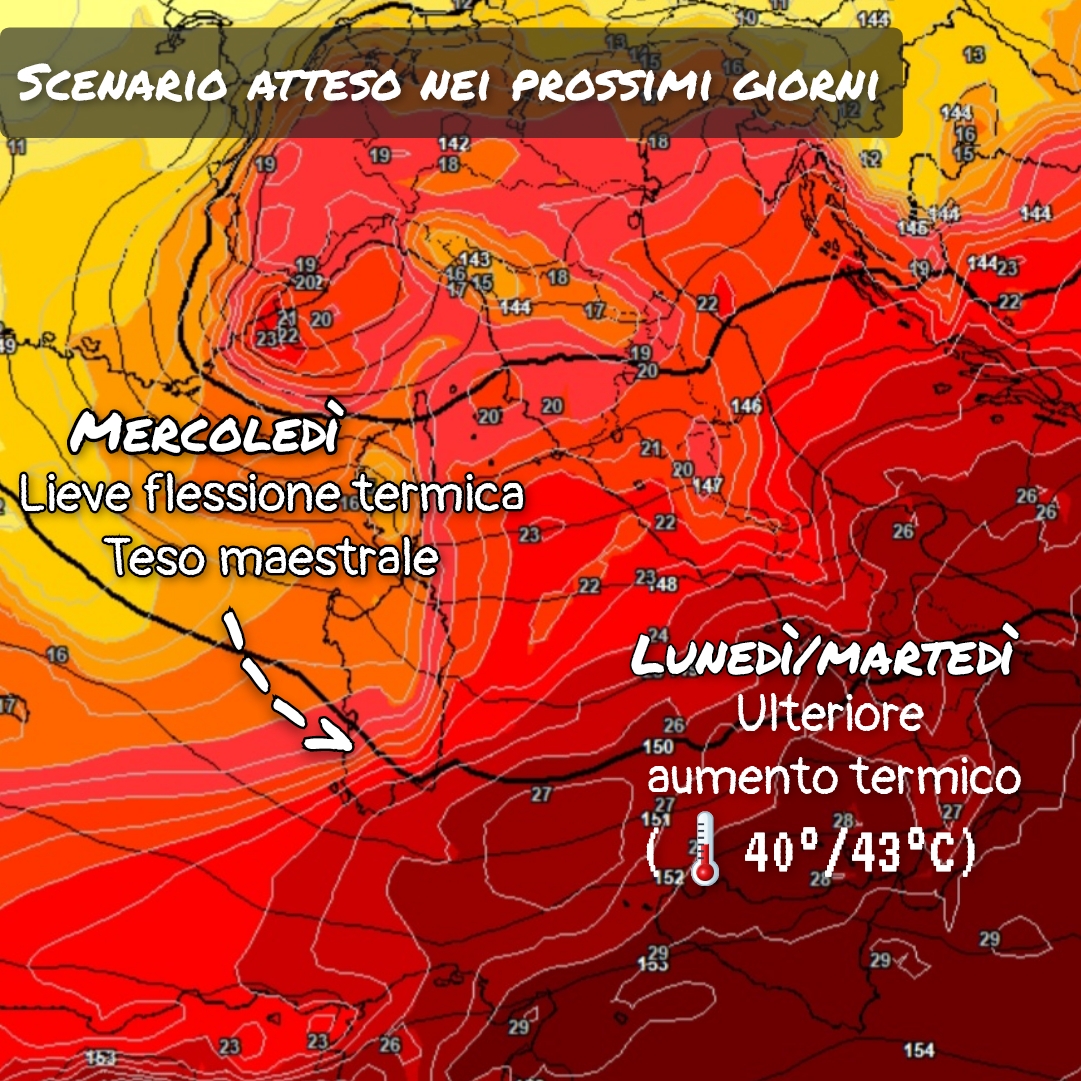 Se in avvio di settimana dovessero presentarsi intervalli con ventilazione meridionale, le temperature potrebbero superare agevolmente i +40°/42°C anche lungo le coste, con picchi estremi fin verso i +43°/44°C.