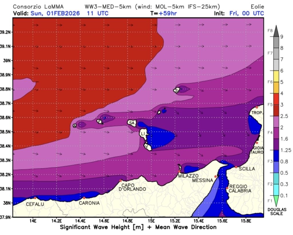 Si segnala, inoltre, un rinforzo della ventilazione di tramontana e grecale tra la tarda serata di sabato e il primo mattino di Domenica, con possibili raffiche intorno ai 60km/h e conseguente aumento del moto ondoso del Tirreno che potrà divenire molto mosso o temporaneamente agitato. Il Mar Ionio potrà subìre anch’esso un incremento del moto ondoso nella notte di sabato su Domenica, ma la componente da Nord/nordest non permetterà, fortunatamente, la formazione di onde rilevanti (attese onde fino a circa 2m).