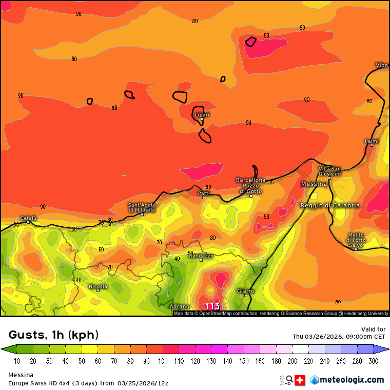 La ventilazione risulterà sostenuta già al mattino (60km/h) per poi divenire forte dal pomeriggio, quando sono attese raffiche di ponente fino a circa 80km/h, con picchi intorno ai 90km/h nei pressi delle Eolie e sui crinali montuosi nebroidei e peloritani.