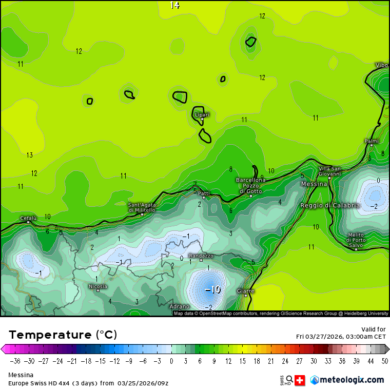 La quota neve, di pari passo, vedrà un netto calo di quota dalle ore serali, consentendo fioccate dai 700m in caso di rovesci moderati/forti e dando luogo a nevicate con accumulo oltre i 900/1000m tra i Nebrodi e i Peloritani. Entro fine giornata potranno accumularsi intorno ai 10cm sui rilievi nebroidei più elevati ed interni.
