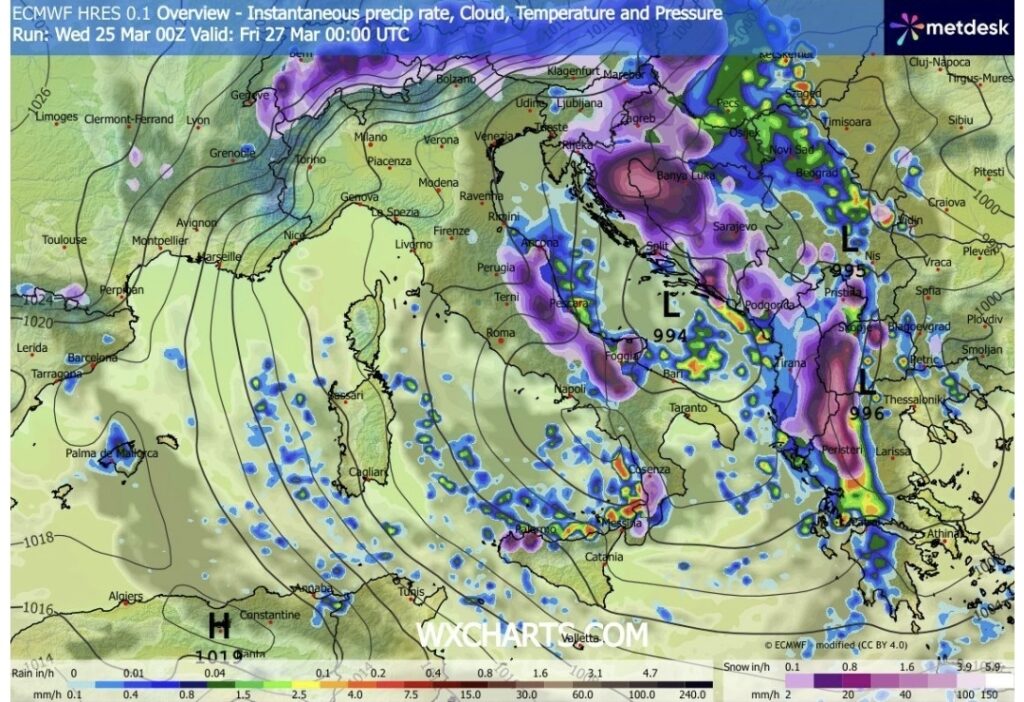Tale fase perturbata, destinata a caratterizzare anche le giornate di venerdì 27 e parte di sabato 28 marzo, sarà accompagnata anche da masse d’aria piuttosto fredde, specie per il periodo attuale (fino a 0°/-1°C ad 850hPa), con ritorno della neve dalla bassa montagna tra venerdì notte e le successive ore mattutine/pomeridiane.