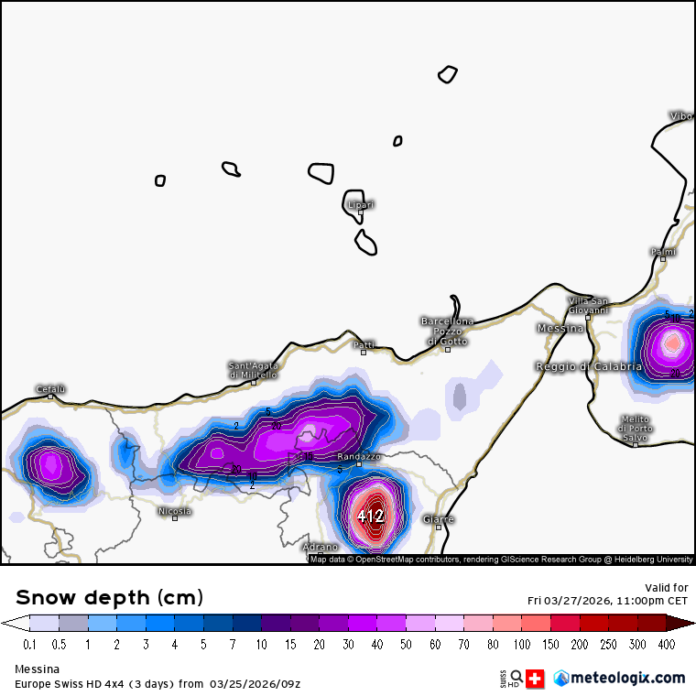 La quota neve, di pari passo, vedrà un netto calo di quota dalle ore serali, consentendo fioccate dai 700m in caso di rovesci moderati/forti e dando luogo a nevicate con accumulo oltre i 900/1000m tra i Nebrodi e i Peloritani. Entro fine giornata potranno accumularsi intorno ai 10cm sui rilievi nebroidei più elevati ed interni.