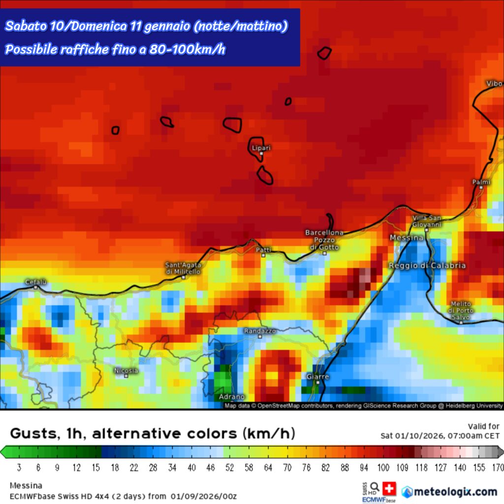 VENTO E MARE Un tratto saliente di tale fase perturbata sarà il vento (che in realtà quest’oggi ha subìto solo una parziale attenuazione). Nel corso della prossima notte e, soprattutto dal mattino di domani (sabato 10) è atteso il ritorno di raffiche di ponente oltre i 70km/h sul basso Tirreno e lungo le omonime coste; un ulteriore rinforzo è atteso tra il pomeriggio e la sera con raffiche da WNW possibilmente vicine ai 100km/h tra alcuni tratti costieri tirrenici (messinese centro-occidentale in primis) e l’arcipelago eoliano, oltre che sui crinali nebroidei e peloritani. Nel corso di Domenica la ventilazione, da NW, subirà una parziale attenuazione, più avvertibile dal pomeriggio, poiché fino al mattino saranno possibili residue raffiche >80km/h. Il Mar Tirreno, pertanto, diverrà agitato nel corso di sabato con onde fino a 4m; tendenza a parziale attenuazione (molto mosso) nel corso di Domenica. Poco mosso o mosso il Mar Ionio.