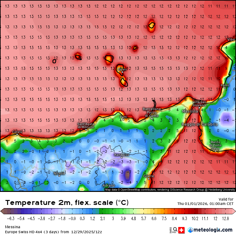 La nostra Isola rimarrà ai margini di tale discesa fredda, tuttavia nell’intervallo sopra citato è atteso l’arrivo di isoterme ad 850hPa fino a 0/-1°C con conseguente regime termico piuttosto freddo anche al suolo. La notte di San Silvestro potrà pertanto far registrare valori minimi fino a -2°/1°C sui Nebrodi, fino a +2°/4°C in collina e fino a +5°/7°C lungo le coste.