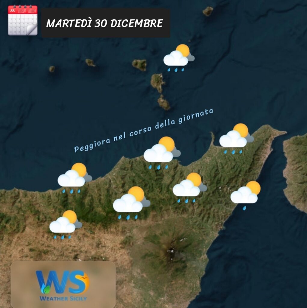 La giornata di domani, martedì 30 dicembre, vedrà difatti l’ingresso di una veloce perturbazione. La prima parte di giornata vedrà un contesto caratterizzato dal transito di nuvolosità, con possibilità di prime precipitazioni. Quest’ultime, comunque, risulteranno più diffuse tra il pomeriggio e la sera. Trattandosi di instabilità proveniente dalle acque del basso Tirreno, l’omonimo settore del messinese risulterà maggiormente interessato da tale instabilità, mentre potrà trovarsi più ai margini il settore ionico ove comunque potrà verificarsi qualche pioggia tra l’alto messinese ionico e l’area dello Stretto nella seconda parte di giornata. Tra il tardo mattino e il pomeriggio è atteso un rinforzo della ventilazione di ponente con raffiche fino a 40-50km/h sul comparto tirrenico.Il moto ondoso del Mar Tirreno nel corso del pomeriggio subirà un incremento divenendo mosso, poco mosso il Mar Ionio.