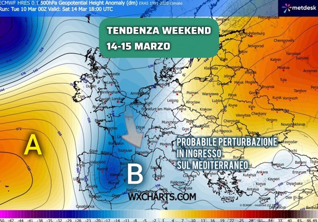 Nel frattempo però la saccatura nord-atlantica, spinta da un ramo della depressione islandese, inizierà ad organizzare la sua discesa dapprima probabilmente verso la Francia e poi eventualmente verso il cuore del Mediterraneo, a partire da sabato-domenica.