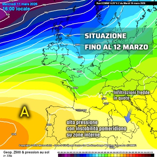 L’influenza di una goccia fredda isolata nei giorni scorsi sulla penisola iberica, dopo aver portato qualche pioggia lo scorso venerdì, ha lasciato spazio – già da domenica – ad infiltrazioni di aria più fredda in quota (alla media troposfera, fino a – 23/25°C a 500hPa).