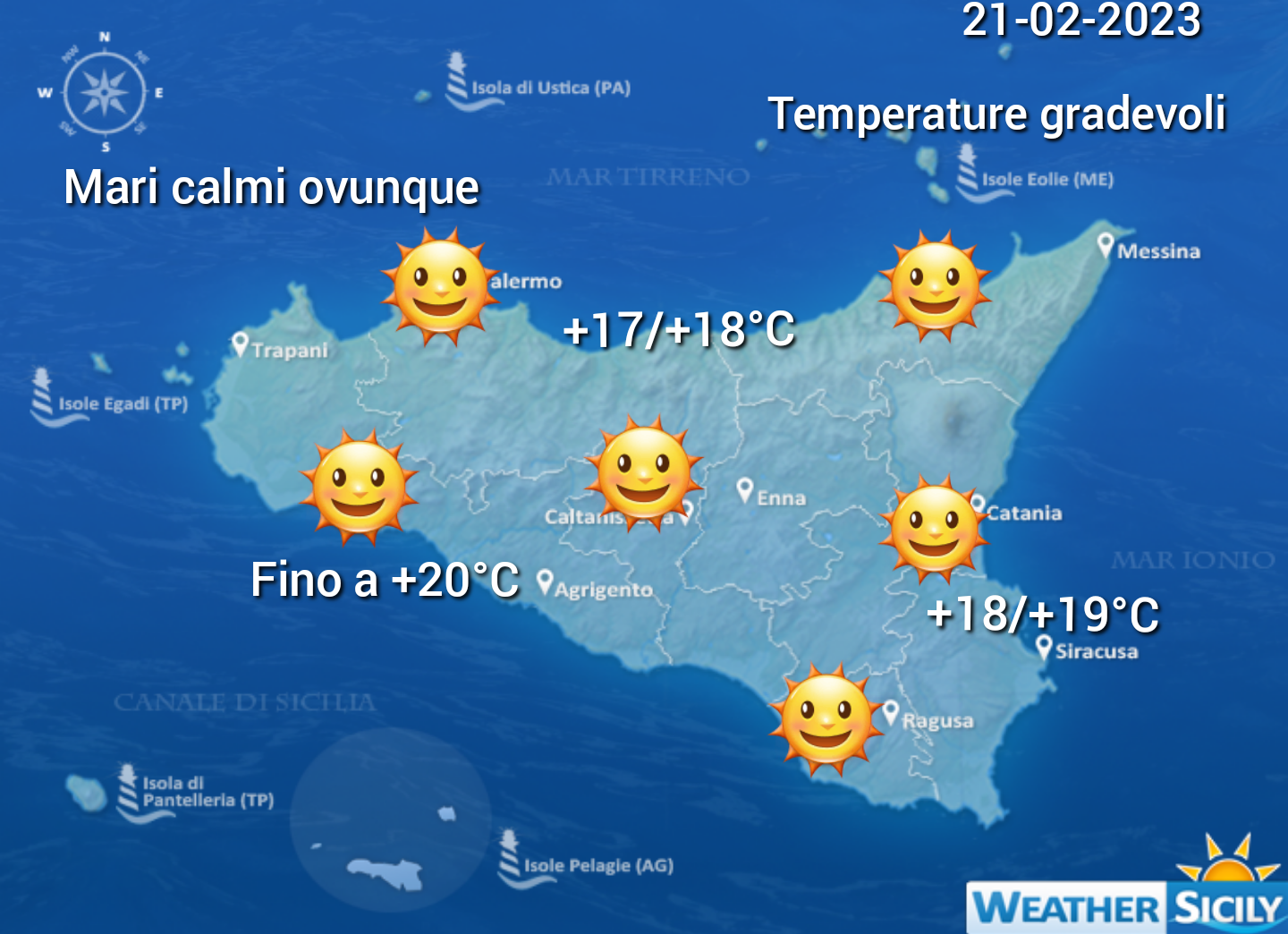 Il vasto campo di alta pressione che ci interessa ormai da qualche giorno, continuerà anche nel proseguo della settimana a regalarci giornate prettamente stabili e temperature molto gradevoli, specie nelle ore diurne. Già quest’oggi si sono localmente superati i +20.0°C tra basso trapanese ed agrigentino, ed anche nei prossimi giorni tale valore potrà essere nuovamente raggiunto. Stando all’assenza di ventilazione i mari risulteranno pressoché calmi ovunque, facendoci vivere ancora delle giornate simil primaverili.