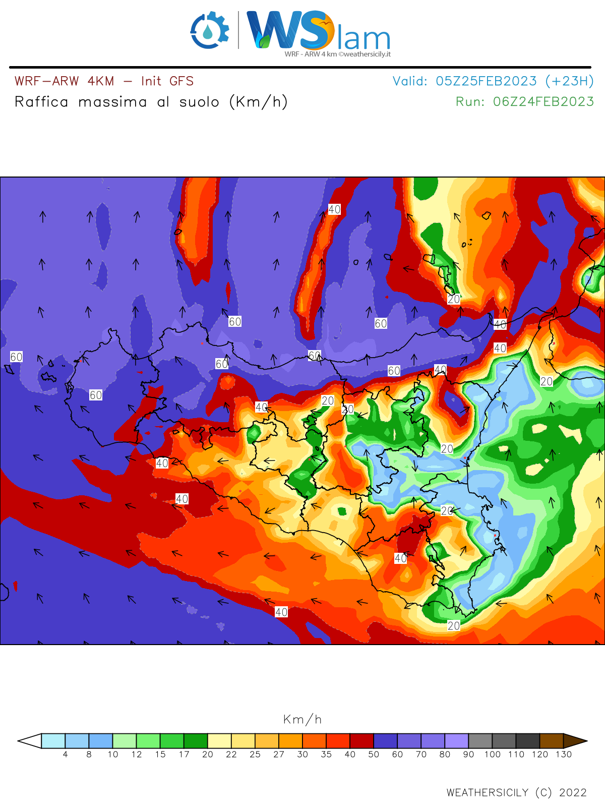 Nelle prossime ore ci attendiamo un ulteriore rinforzo della ventilazione meridionale, specie lungo i settori tirrenici settentrionali che perdureranno per tutta la notte e localmente si potranno registrare raffiche max fino a 70/80 km/h. Trattandosi principalmente di venti molto secchi e caldi, ci aspettiamo quindi valori termici fino ed anche oltre i +20°C localmente in questi settori (palermitano, messinese e trapanese) in piena notte. Anche la mattinata di domani dovrebbe proseguire su questa falsariga, mentre dal pomeriggio ci attendiamo un cambio di circolazione di cui parleremo nel prossimo aggiornamento.