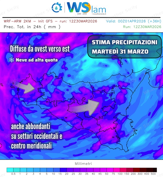 Dalla notte-mattina rovesci e possibili temporali in arrivo da ovest a partire dai settori centro occidentali, in estensione agli altri settori in giornata. Passaggio perturbato localmente abbondante su settori occidentali e centro meridionali. Nevicate in montagna oltre i 1300-1400 metri, non si esclude localmente a quote inferiori. Dal pomeriggio possibile pausa precipitativa col transito del minimo pressorio sulla Sicilia, poi l’instabilità potrebbe tornare tra palermitano, trapanese e versanti occidentali con la rotazione delle correnti in serata dai quadranti settentrionali.