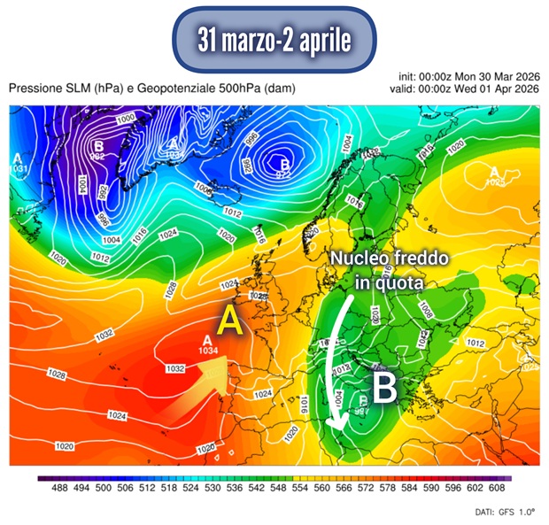 Un robusto anticiclone delle Azzorre si spinge fino al Regno Unito, favorendo sul bordo orientale la discesa di una saccatura alimentata da aria fredda diretta dal nord Europa verso l’Italia. L’intensità della fase fredda sarà minore rispetto ai giorni scorsi, ma con valori termici simil invernali, che alla quota di 850hPa (a circa 1350 metri) oscilleranno nei prossimi giorni tra +1/+3°C.