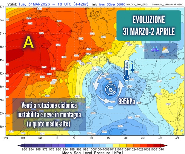 - martedì 31 un primo peggioramento frontale in estensione da ovest/sud ovest. Successivamente, il minimo barico si andrà a posizionare tra la Sicilia e la Calabria. La curvatura ciclonica favorirà un netto cambio delle correnti in quota e al suolo, che da martedì sera e poi mercoledì si disporranno invece dai quadranti nord occidentali.