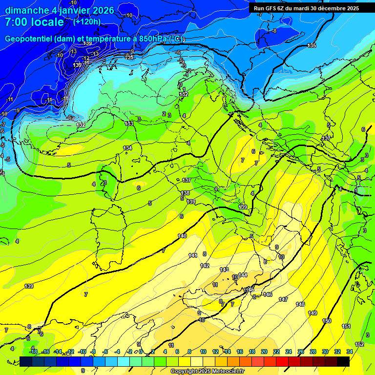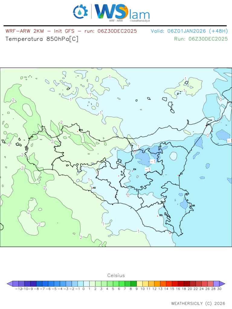 La sua discesa verso latitudini più basse continuerà anche nelle prossime ore, andando a coinvolgere maggiormente tutto il settore Balcanico, la Turchia e parte della Grecia. La nostra penisola si vedrà solamente lambita da questa discesa fredda, in quanto l’asse della colata non risulterà favorevole per noi. Tuttavia, i settori adriatici e parte del nord-est, risultando maggiormente esposti a questo tipo di configurazione, vivranno 48 ore di pieno inverno. Anche se la nostra regione risulterà ai margini di questa ondata di freddo, ne risentirà ugualmente degli effetti, con le temperature che tra la notte di San Silvestro, ed il primo dell’anno, raggiungeranno valori in quota 850 hPa (1500 metri circa) intorno 0/-1°C sulle zone più orientali dell’isola, mentre altrove intorno +1/2°C. Gli effetti del passaggio freddo saranno così piu tangibili sulle zone centro orientali della Sicilia, come mostrato dalla mappa in basso.