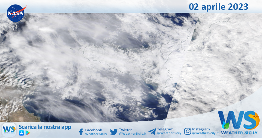 Salve amici di weathersicily.it. Come di consueto vi mostriamo l’immagine satellitare odierna della Nasa, di domenica 02 aprile 2023, la quale ritrae la nostra isola.