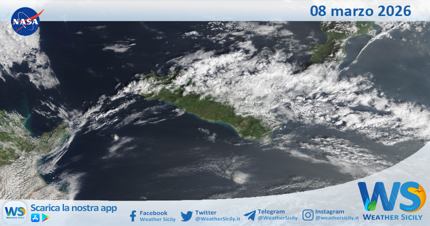 IMMAGINI NASA Meteo Sicilia: immagine satellitare Nasa di domenica 08 marzo 2026 Di Redazione - 8 Marzo 2026 0 11 FacebookTelegramWhatsApp Tempo di lettura: < 1 minutiSalve amici di weathersicily.it. Come di consueto vi mostriamo l’immagine satellitare odierna della Nasa, di domenica 08 marzo 2026, la quale ritrae la nostra isola.