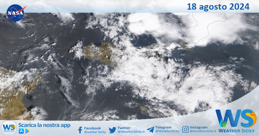 Salve amici di weathersicily.it. Come di consueto vi mostriamo l’immagine satellitare odierna della Nasa, di domenica 18 agosto 2024, la quale ritrae la nostra isola.