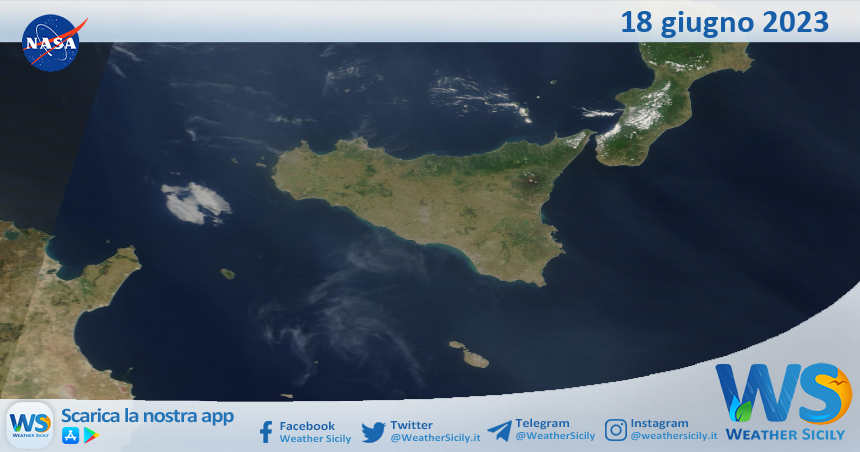 Salve amici di weathersicily.it. Come di consueto vi mostriamo l’immagine satellitare odierna della Nasa, di domenica 18 giugno 2023, la quale ritrae la nostra isola.