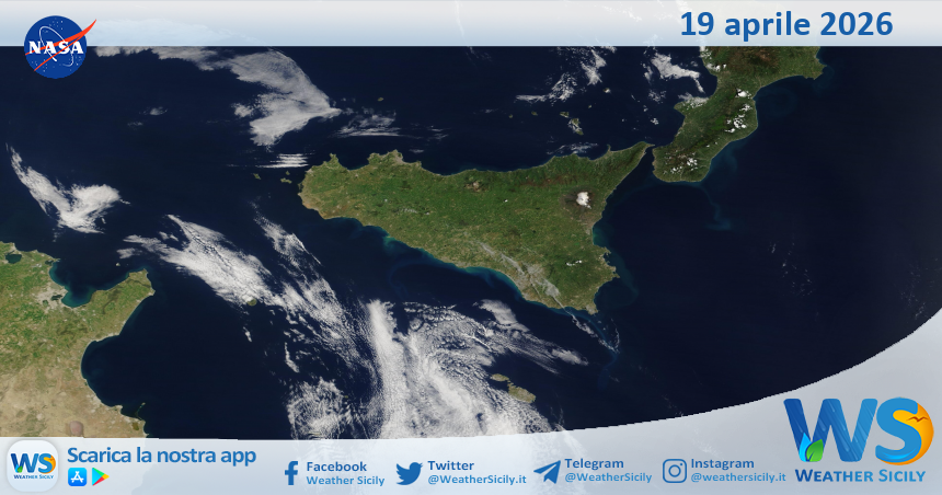 IMMAGINI NASA Meteo Sicilia: immagine satellitare Nasa di domenica 19 aprile 2026 Di Redazione - 19 Aprile 2026 0 0 FacebookTelegramTwitterWhatsAppCopy URL Tempo di lettura: < 1 minutiSalve amici di weathersicily.it. Come di consueto vi mostriamo l’immagine satellitare odierna della Nasa, di domenica 19 aprile 2026, la quale ritrae la nostra isola.