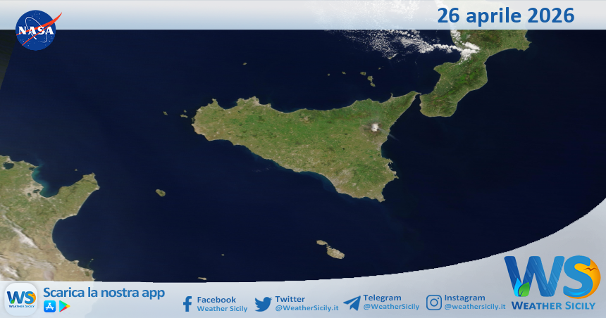 IMMAGINI NASA Meteo Sicilia: immagine satellitare Nasa di domenica 26 aprile 2026 Di Redazione - 26 Aprile 2026 0 0 FacebookTelegramTwitterWhatsAppCopy URL Tempo di lettura: < 1 minutiSalve amici di weathersicily.it. Come di consueto vi mostriamo l’immagine satellitare odierna della Nasa, di domenica 26 aprile 2026, la quale ritrae la nostra isola.