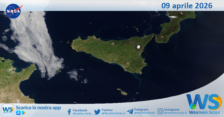 IMMAGINI NASA Meteo Sicilia: immagine satellitare Nasa di giovedì 09 aprile 2026 Di Redazione - 9 Aprile 2026 0 0 FacebookTelegramTwitterWhatsAppCopy URL Tempo di lettura: < 1 minutiSalve amici di weathersicily.it. Come di consueto vi mostriamo l’immagine satellitare odierna della Nasa, di giovedì 09 aprile 2026, la quale ritrae la nostra isola.