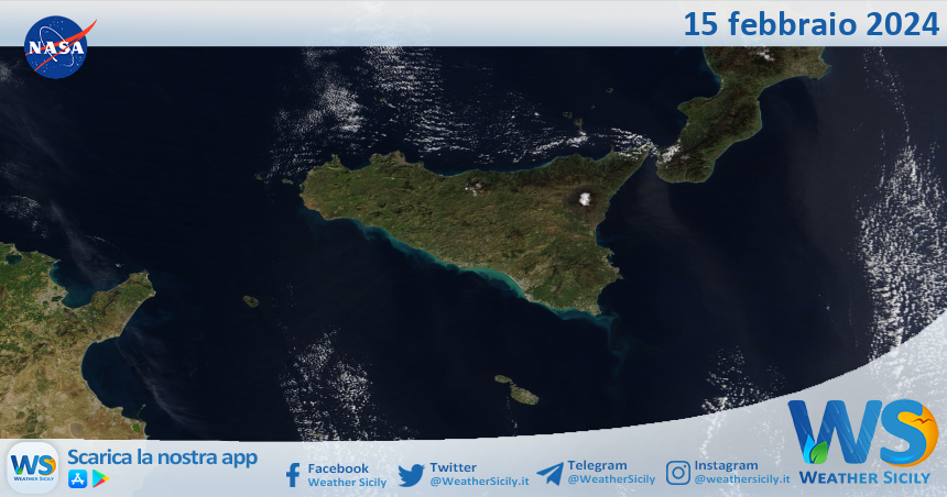Salve amici di weathersicily.it. Come di consueto vi mostriamo l’immagine satellitare odierna della Nasa, di giovedì 15 febbraio 2024, la quale ritrae la nostra isola.