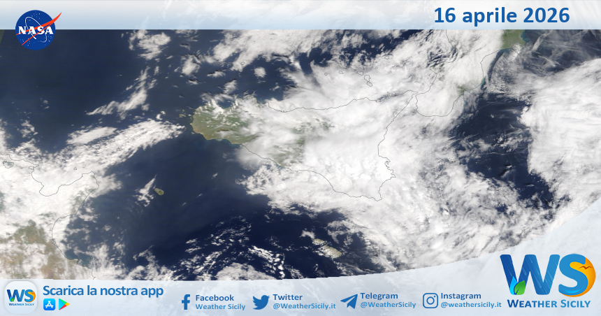 IMMAGINI NASA Meteo Sicilia: immagine satellitare Nasa di giovedì 16 aprile 2026 Di Redazione - 16 Aprile 2026 0 3 FacebookTelegramTwitterWhatsAppCopy URL Tempo di lettura: < 1 minutiSalve amici di weathersicily.it. Come di consueto vi mostriamo l’immagine satellitare odierna della Nasa, di giovedì 16 aprile 2026, la quale ritrae la nostra isola.