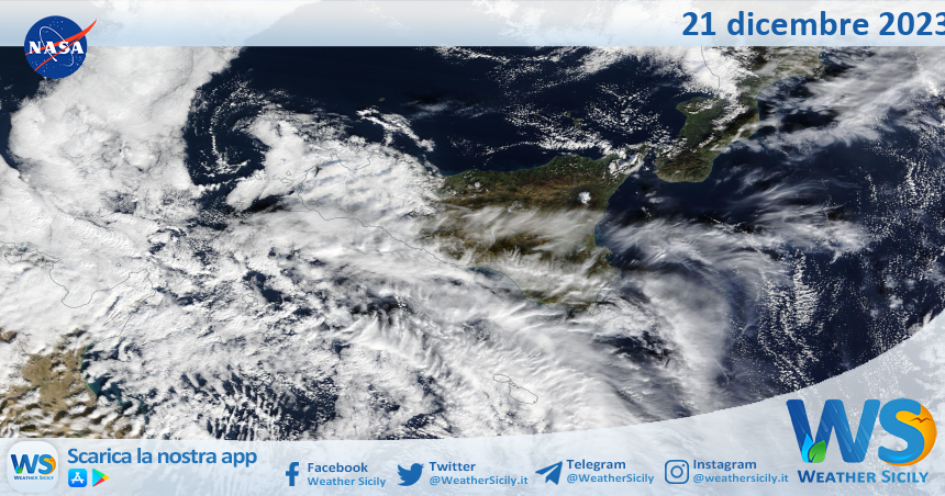 Salve amici di weathersicily.it. Come di consueto vi mostriamo l’immagine satellitare odierna della Nasa, di giovedì 21 dicembre 2023, la quale ritrae la nostra isola.
