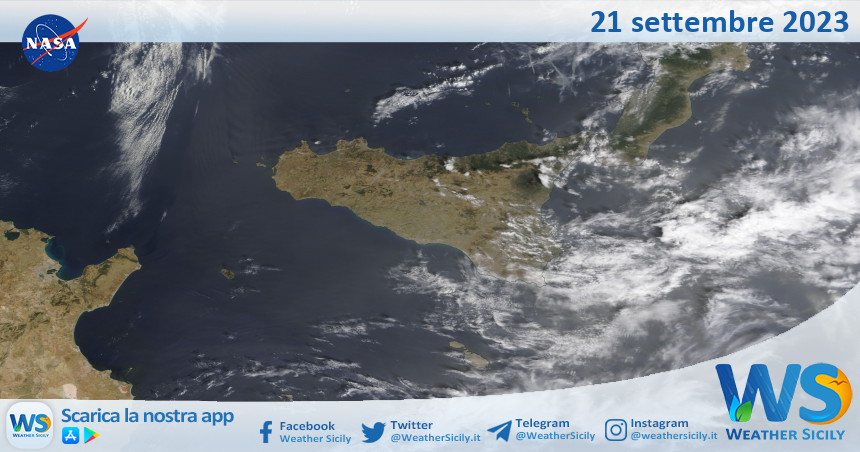 Salve amici di weathersicily.it. Come di consueto vi mostriamo l’immagine satellitare odierna della Nasa, di giovedì 21 settembre 2023, la quale ritrae la nostra isola.