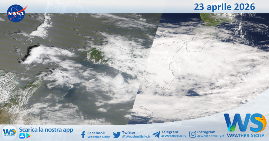 IMMAGINI NASA Meteo Sicilia: immagine satellitare Nasa di giovedì 23 aprile 2026 Di Redazione - 23 Aprile 2026 0 0 FacebookTelegramTwitterWhatsAppCopy URL Tempo di lettura: < 1 minutiSalve amici di weathersicily.it. Come di consueto vi mostriamo l’immagine satellitare odierna della Nasa, di giovedì 23 aprile 2026, la quale ritrae la nostra isola.