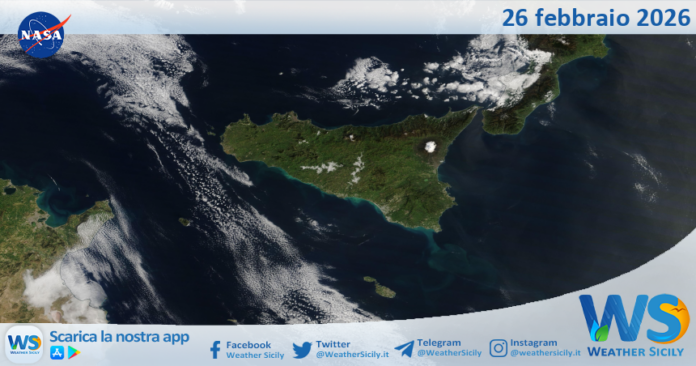 IMMAGINI NASA Meteo Sicilia: immagine satellitare Nasa di giovedì 26 febbraio 2026 Di Redazione - 26 Febbraio 2026 0 20 FacebookTelegramWhatsApp Tempo di lettura: < 1 minutiSalve amici di weathersicily.it. Come di consueto vi mostriamo l’immagine satellitare odierna della Nasa, di giovedì 26 febbraio 2026, la quale ritrae la nostra isola.