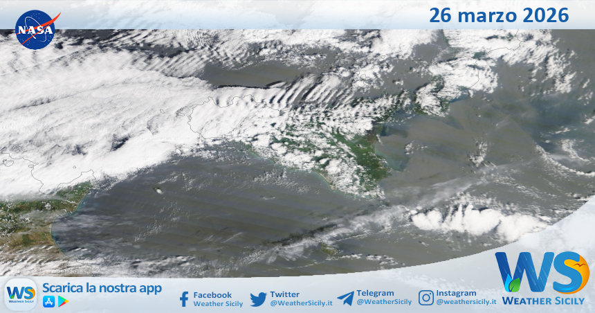 IMMAGINI NASA Meteo Sicilia: immagine satellitare Nasa di giovedì 26 marzo 2026 Di Redazione - 26 Marzo 2026 0 0 FacebookTelegramWhatsApp Tempo di lettura: < 1 minutiSalve amici di weathersicily.it. Come di consueto vi mostriamo l’immagine satellitare odierna della Nasa, di giovedì 26 marzo 2026, la quale ritrae la nostra isola.