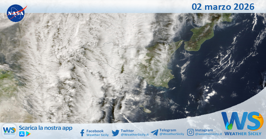 IMMAGINI NASA Meteo Sicilia: immagine satellitare Nasa di lunedì 02 marzo 2026 Di Redazione - 2 Marzo 2026 0 2 FacebookTelegramWhatsApp Tempo di lettura: < 1 minutiSalve amici di weathersicily.it. Come di consueto vi mostriamo l’immagine satellitare odierna della Nasa, di lunedì 02 marzo 2026, la quale ritrae la nostra isola.