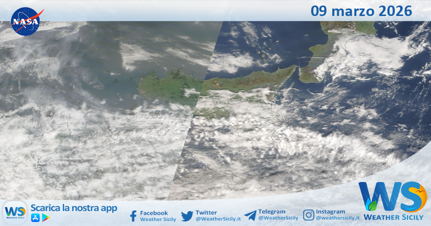 IMMAGINI NASA Meteo Sicilia: immagine satellitare Nasa di lunedì 09 marzo 2026 Di Redazione - 9 Marzo 2026 0 0 FacebookTelegramWhatsApp Tempo di lettura: < 1 minutiSalve amici di weathersicily.it. Come di consueto vi mostriamo l’immagine satellitare odierna della Nasa, di lunedì 09 marzo 2026, la quale ritrae la nostra isola.