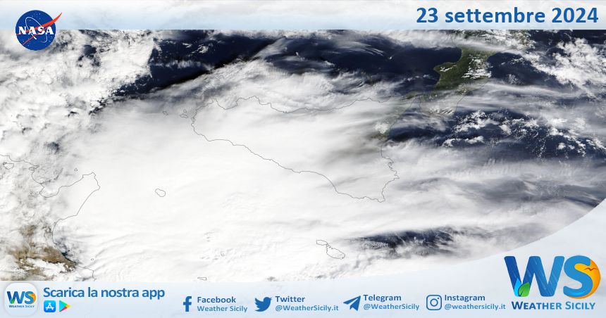 Salve amici di weathersicily.it. Come di consueto vi mostriamo l’immagine satellitare odierna della Nasa, di lunedì 23 settembre 2024, la quale ritrae la nostra isola.