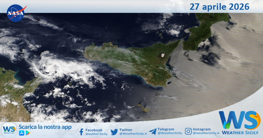 IMMAGINI NASA Meteo Sicilia: immagine satellitare Nasa di lunedì 27 aprile 2026 Di Redazione - 27 Aprile 2026 0 28 FacebookTelegramTwitterWhatsAppCopy URL Tempo di lettura: < 1 minutiSalve amici di weathersicily.it. Come di consueto vi mostriamo l’immagine satellitare odierna della Nasa, di lunedì 27 aprile 2026, la quale ritrae la nostra isola.