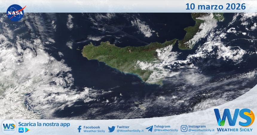 IMMAGINI NASA Meteo Sicilia: immagine satellitare Nasa di martedì 10 marzo 2026 Di Redazione - 10 Marzo 2026 0 7 FacebookTelegramWhatsApp Tempo di lettura: < 1 minutiSalve amici di weathersicily.it. Come di consueto vi mostriamo l’immagine satellitare odierna della Nasa, di martedì 10 marzo 2026, la quale ritrae la nostra isola.