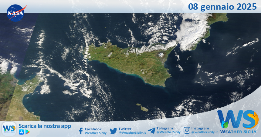 Salve amici di weathersicily.it. Come di consueto vi mostriamo l’immagine satellitare odierna della Nasa, di mercoledì 08 gennaio 2025, la quale ritrae la nostra isola.