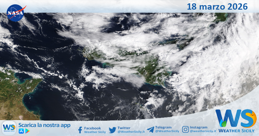 IMMAGINI NASA Meteo Sicilia: immagine satellitare Nasa di mercoledì 18 marzo 2026 Di Redazione - 18 Marzo 2026 0 0 FacebookTelegramWhatsApp Tempo di lettura: < 1 minutiSalve amici di weathersicily.it. Come di consueto vi mostriamo l’immagine satellitare odierna della Nasa, di mercoledì 18 marzo 2026, la quale ritrae la nostra isola.