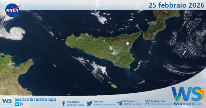 IMMAGINI NASA Meteo Sicilia: immagine satellitare Nasa di mercoledì 25 febbraio 2026 Di Redazione - 25 Febbraio 2026 0 34 FacebookTelegramTwitterWhatsAppCopy URL Tempo di lettura: < 1 minutiSalve amici di weathersicily.it. Come di consueto vi mostriamo l’immagine satellitare odierna della Nasa, di mercoledì 25 febbraio 2026, la quale ritrae la nostra isola.